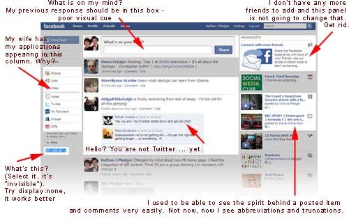 I’m not going to be the first and I won’t be the last to write about this, so I won’t labour the point. Hopefully the graphic says it all. The new Facebook home page seems to be trying to be more like Twitter than actually bringing prople together, which it was previously very good at. With the posted items and “ancillary” activity being demoted to the right column, I am now no longer as immersed in what my friends are posting, doing or playing. Some of my friends posted articles of interest, which allowed me to comment there and then. Now I only see abbreviations. The core area is now trying to be a Twitter copy, being filled with everyone’s status updates … oh, sorry “whatever is on their mind”.