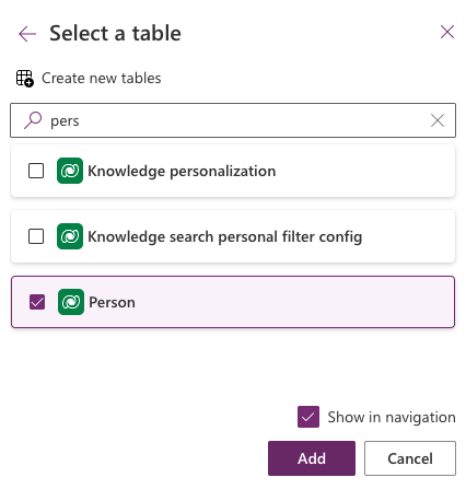 Add the Person Dataverse table to the navigation on the Model-View-app within the Main navigation section: