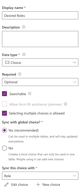 Therefore, we should have a field with two available options. This can be added as a Choice column to the Person table, using a Global Choice list: