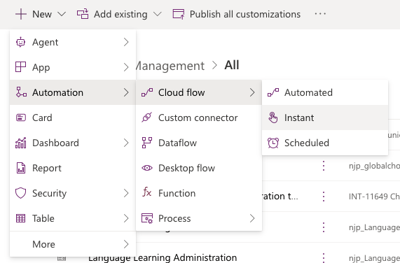Within the Solution, click New > Automation > Cloud Flow > Instant to create the Flow.