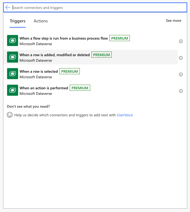 The designer will load with an initial trigger selection requirement. Select the Dataverse triggers, and the “When a row is added, modified or deleted” trigger.